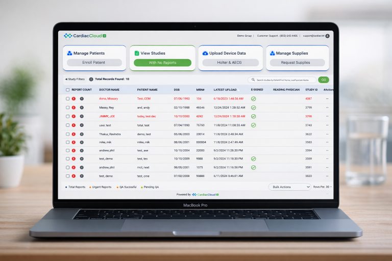 For Physicians Streamlined Dashboard Easily identify which reports need your attention with a clear, organized dashboard, saving you time and effort. Expert Reporting Rely on our team of experienced certified cardiac technicians to deliver accurate insights giving you peace of mind and confidence. Customizable Reports Tailor reports to your specific needs, with configurable options that make interpreting patient data more efficient and precise. Fast Report Turnaround Get detailed reports the next business morning or in just 4 hours with our STAT service, allowing for quicker diagnoses and patient management. Centralized Device Management Easily manage all devices through a centralized cloud platform, simplifying data uploads and enhancing workflow efficiency. Prescribe & Start Study Keep as many disposable patch devices on hand as needed – no more delays from shipping or waiting for devices to return. Ready to see CardiacCloud AI in action? Book a demo and we’ll walk through device onboarding, cloud triage, and (Gen)AI assisted reporting.